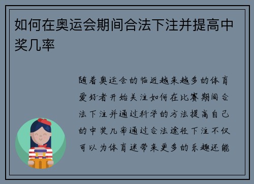 如何在奥运会期间合法下注并提高中奖几率